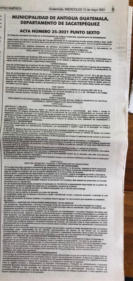 El Concejo de La Antigua Guatemala, Sacatepéquez, aprobó el Reglamento de Donaciones, Subvenciones y Ayuda Social para el municipio el 19 de abril (acta No. 35-2021) y publicado en el diario oficial el pasado 12 de mayo.