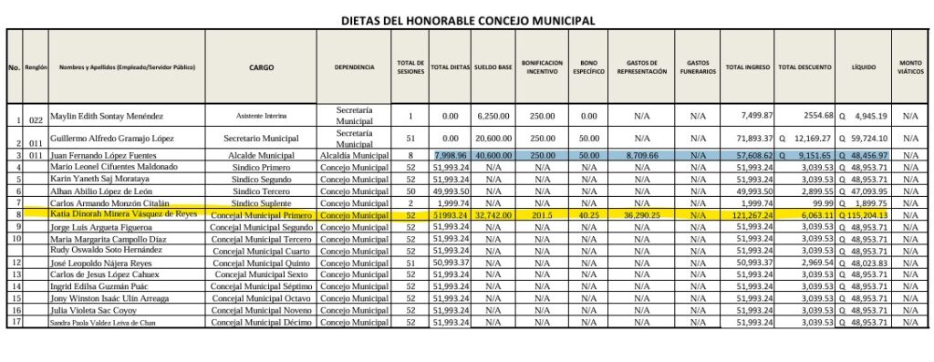 De acuerdo con la panilla de dietas encontrada en el apartado de información pública de oficio del sitio web de la municipalidad, el alcalde devengó durante los primeros días de julio previo a tomar sus vacaciones Q7 mil 998.96 de dietas por asistir a 8 sesiones lo que equivale a una semana.