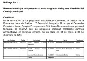 La Contraloría General de Cuentas en sus hallazgos publicados en mayo de 2018 encontró que tres sobrina del actual alcalde Carlos González tenían contratos laborales con la municipalidad: una maestra, la directora de la academia de Inglés y una instructora de zumba. Por este caso hay una denuncia en el Ministerio Público.