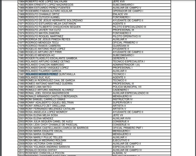 Su hijo, Rolando Moisés Pérez Quintanilla, trabaja en municipalidad de Mixco desde marzo 2020 como técnico I.