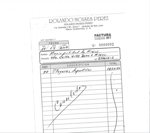 A través de Facebook Live, Bran negó cualquier vínculo con Rolando Moisés Pérez, pero una factura emitida por el propio Pérez el 11 de septiembre de 2017 a Mixco muestra lo contrario. Se trata de una venta de 50 playeras deportivas por Q1 mil 837.