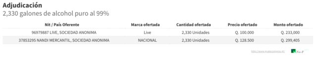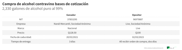 Otra de las adjudicaciones de Villa Nueva fueron 2,330 galones de alcohol puro al 99% (NOG 12296627). En este caso de esta compra, hubo dos oferentes y, a pesar de que tanto en el precio, como en el tiempo de entrega, el oponente presentaba mejores condiciones, la municipalidad entregó el contrato a NANDI S.A. en este caso por Q299,405.
