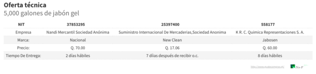 Para esta oferta, NANDI S.A. fue el único oferente y, por las prerrogativas del Estado de Calamidad, la municipalidad de Villa Nueva se pudo saltar la ley de compras y contrataciones del Estado y no necesitar más cotizaciones para otorgar el contrato.