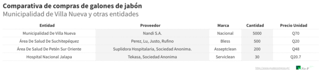 El 24 de marzo, el área de Salud de Suchitepéquez compró 500 galones de jabón en gel, cada uno a Q20 (NOG 12298484), más de tres veces más barato al jabón adquirido por Villa Nueva, a Q70.