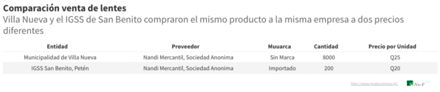 En abril aparece una venta de lentes de bioseguridad de NANDI al IGSS de San Benito, en Petén (NOG 12303615). Éste compra de 200 lentes, cada uno a Q20. Es decir NANDI S.A. vendió lentes a Q5 más caros a la municipalidad de Villa Nueva que al IGSS de San Benito. Así, con un mismo producto, y misma empresa, el foco de sobrevaloración alude a Villa Nueva.