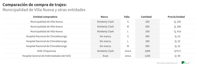 Es decir, el IGSS de Chiquimula pagó 75 quetzales por cada traje de marca Kimberly-Clark, con las especificaciones arriba descritas. Villa Nueva pagó hasta Q410 por cada traje de la misma marca.