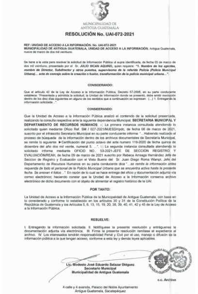 La creación de la Policía Municipal Urbana (PMU) de La Antigua Guatemala pasó desapercibida el 20 de febrero cuando se oficializó. Fue hasta ocho días después con la muerte de Luis Solórzano a manos de tres agentes de la PMU y que fue captada por cámaras de la comuna, que se habló de su legalidad.