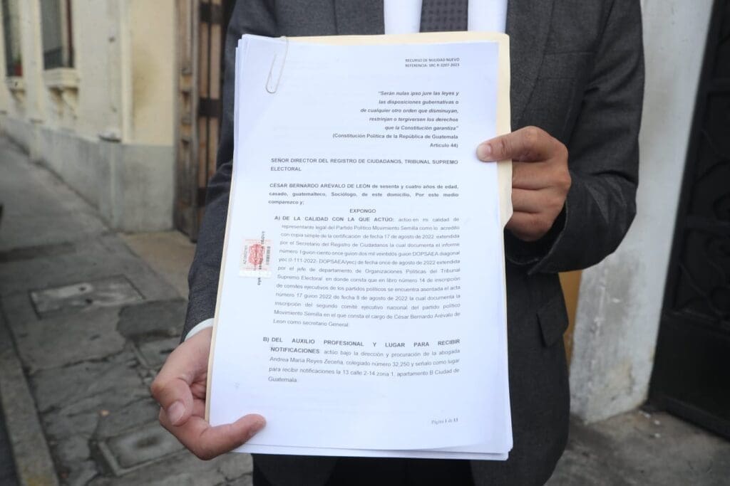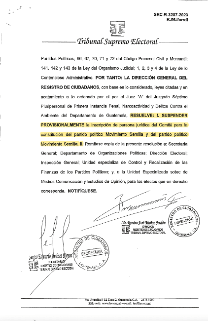 El MP presume que Movimiento Semilla usó firmas falsas para constituirse y el juez penal Fredy Orellana, sancionado como un actor corrupto por el Departamento de Estado de los Estados Unidos, ordenó suspender la personería jurídica de la organización el 12 de julio, pero la Corte Suprema de Justicia (CSJ) resolvió que no procede suspender un partido durante el proceso electoral.