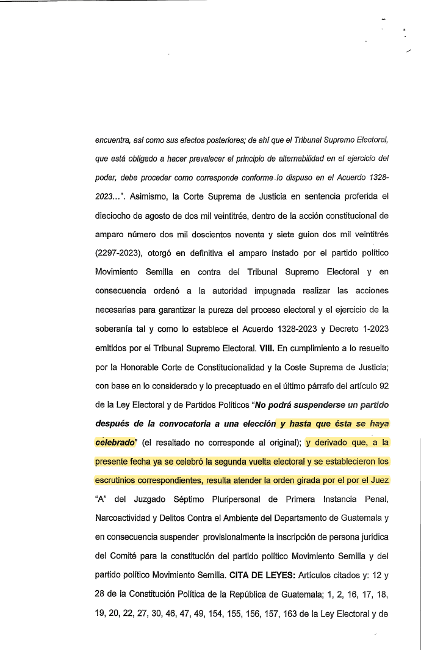 - El proceso electoral es independiente del proceso administrativo de un partido político. Se suspenda o no la organización (lo que quedará en firme al agotar la última instancia), no afecta la toma de posesión de Bernardo Arévalo y Karin Herrera en 2024.