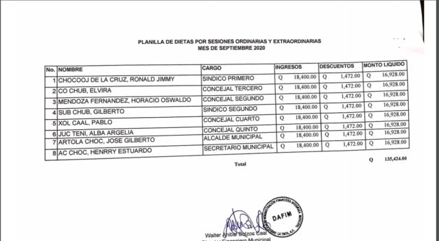 El último dato disponible en septiembre de este año se denomina “remuneraciones especiales” y lo actualizó el director financiero municipal, Walter Aníbal Botzoc Caal. En este se constata que cada integrante de la corporación cobró Q20 mil de sueldo, un bono de Q250 mil y Q20 mil 700 en dietas. Con ello, sus ingresos superan los Q41 mil solo ese mes, aunque en las sumas de la nómina municipal solo devengaron Q38 mil 750 cada uno.