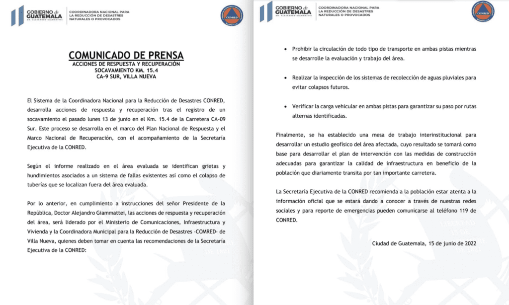 Se trata de una carretera centroamericana (CA-9 Sur), donde ahora la municipalidad de Villa Nueva y el ministerio de Comunicaciones están en trabajos para rehabilitar el camino. Según el director de comunicación de la primera, Byron Morataya, se hizo un estudio donde se encontró que una falla geológica provocó el colapso de un colector subterráneo y por eso se produjo el agujero.