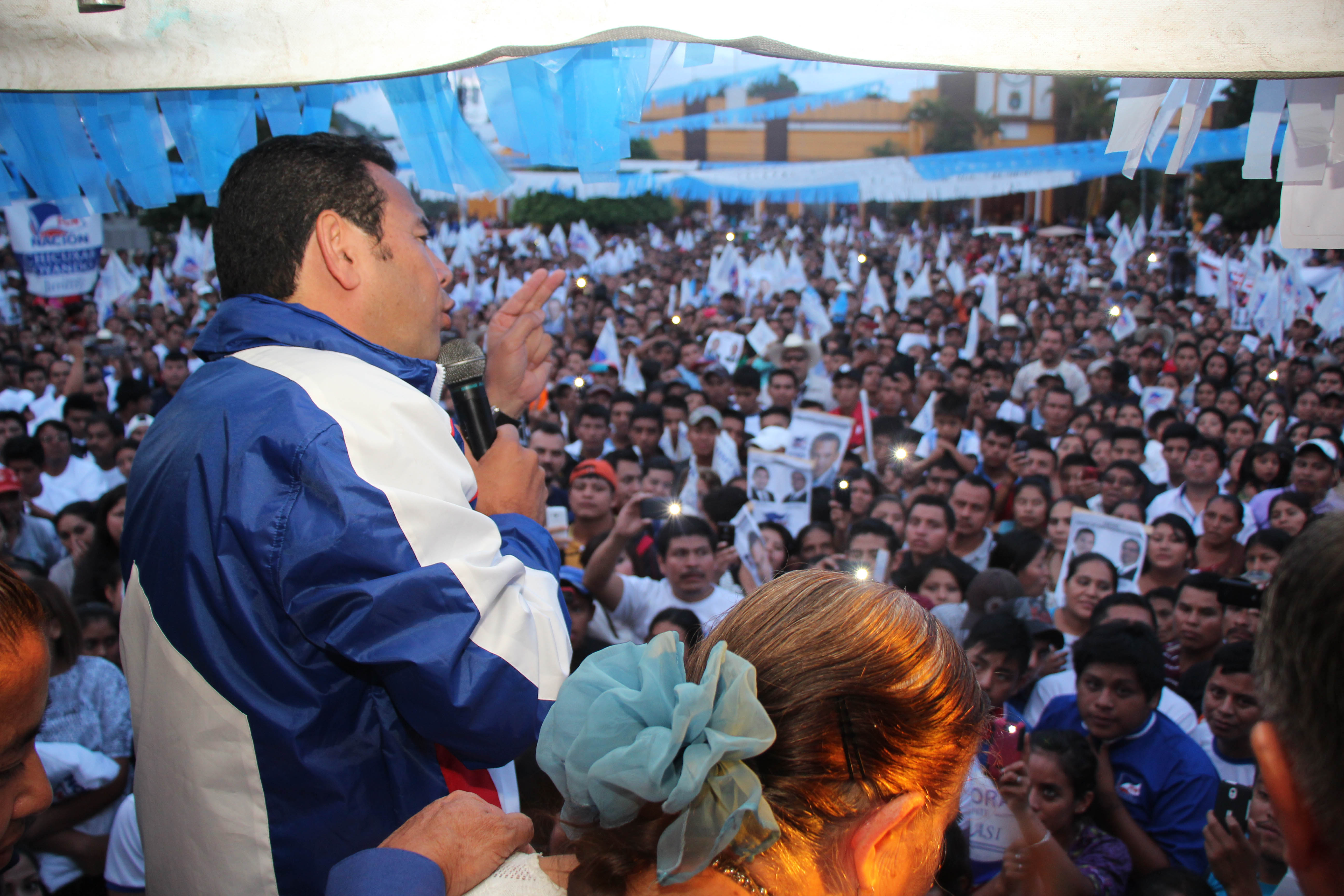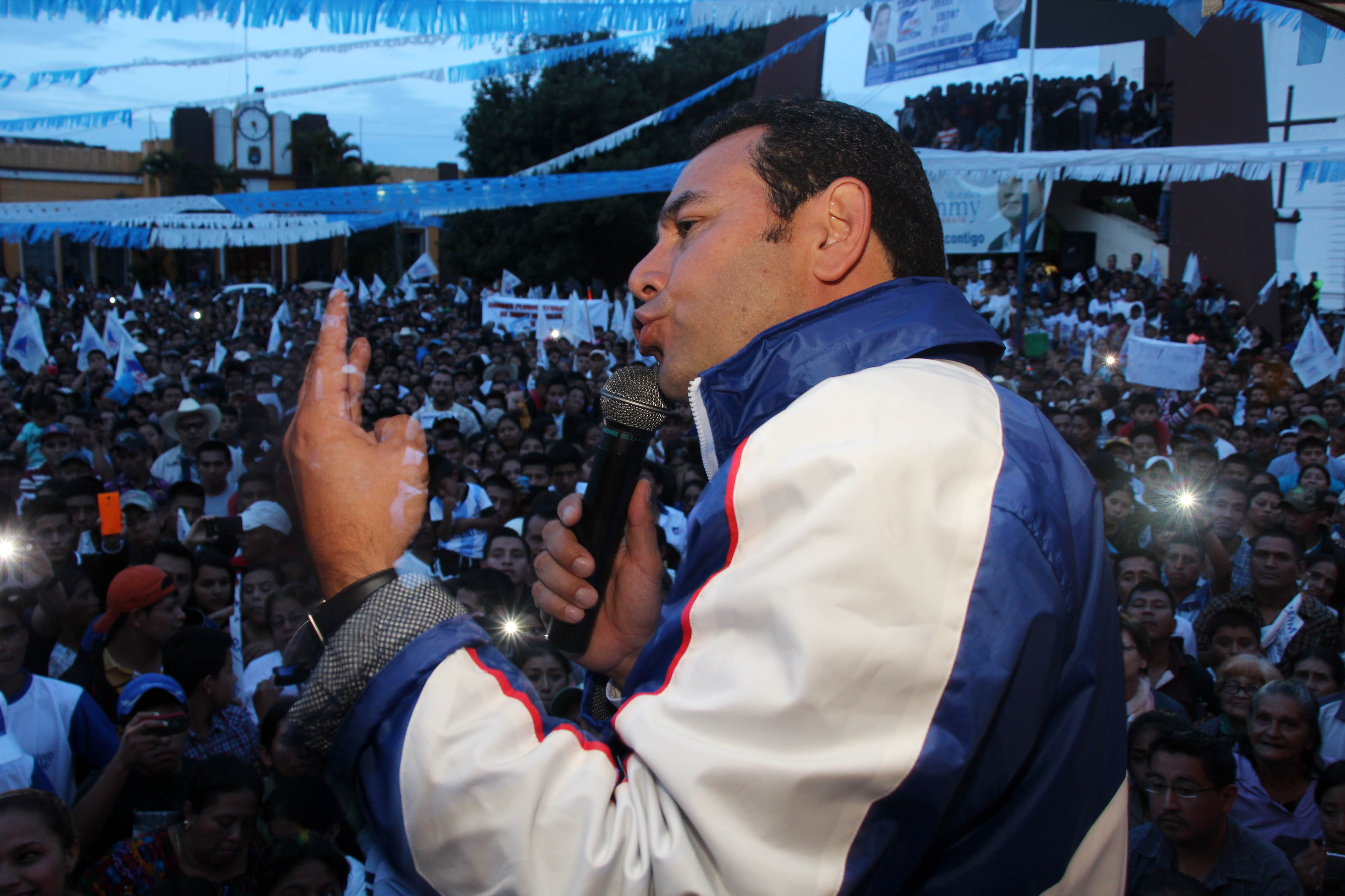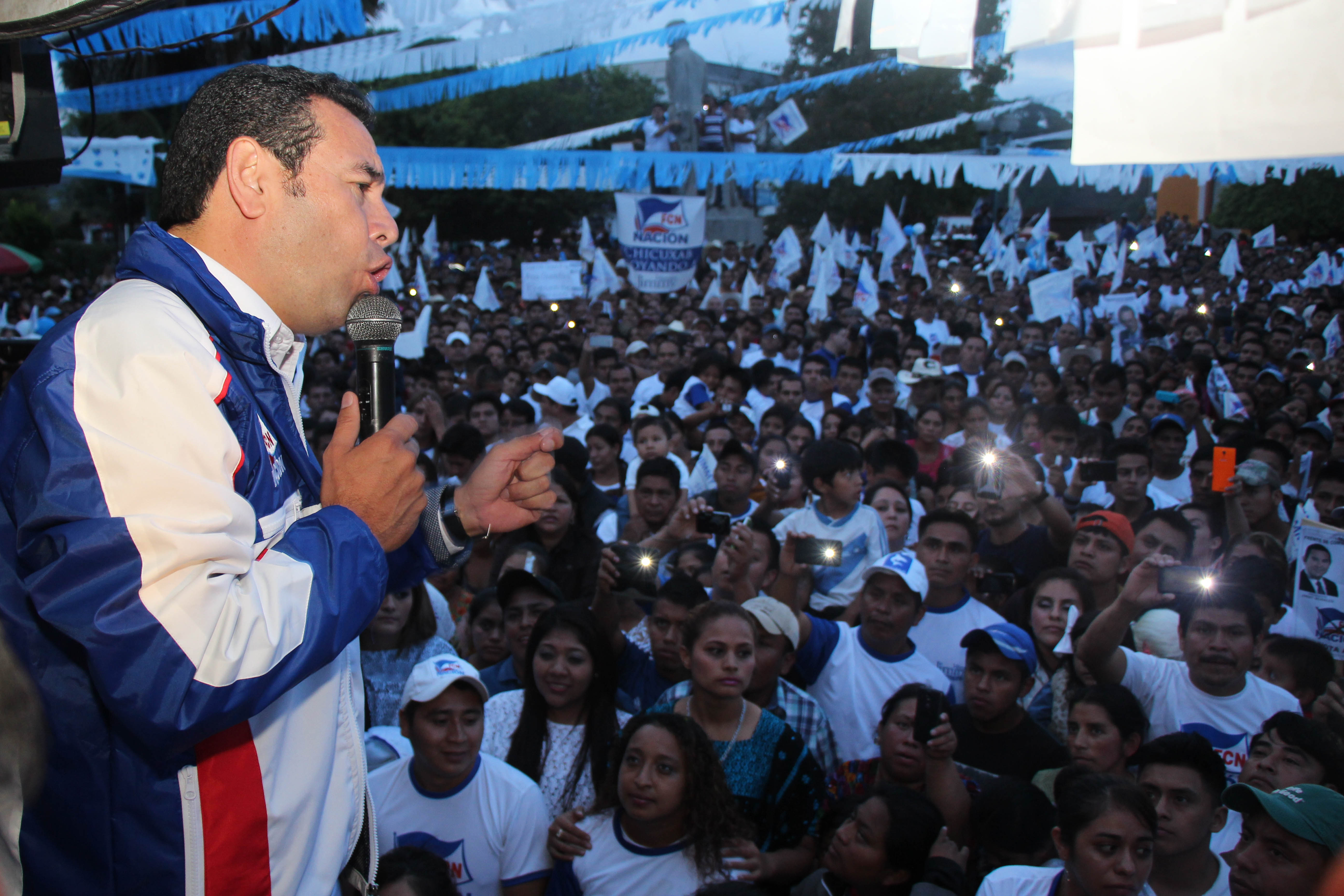 Los dirigentes aseguraron que la visita se había adelantado porque que el mal clima imperante a nivel nacional había mejorado ese día. En un extremo del parque central, con dos lámparas a los costados y sonido que no abarcaba la totalidad de la plaza, Jimmy Morales se dirigió a la población. Inició con la moraleja de la luciérnaga con la serpiente y mencionó que la primera era cada uno de sus simpatizantes que debían brillar con luz propia.