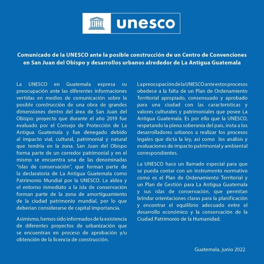 La misma que declaró en 1979 Patrimonio Cultural de la Humanidad a La Antigua Guatemala, se pronunció por la construcción de una obra en San Juan del Obispo y otros desarrollos urbanos alrededor. Sí, la Organización de las Naciones Unidas para la Educación, la Ciencia y la Cultura (UNESCO) está preocupada, así lo indicó a través de un comunicado.