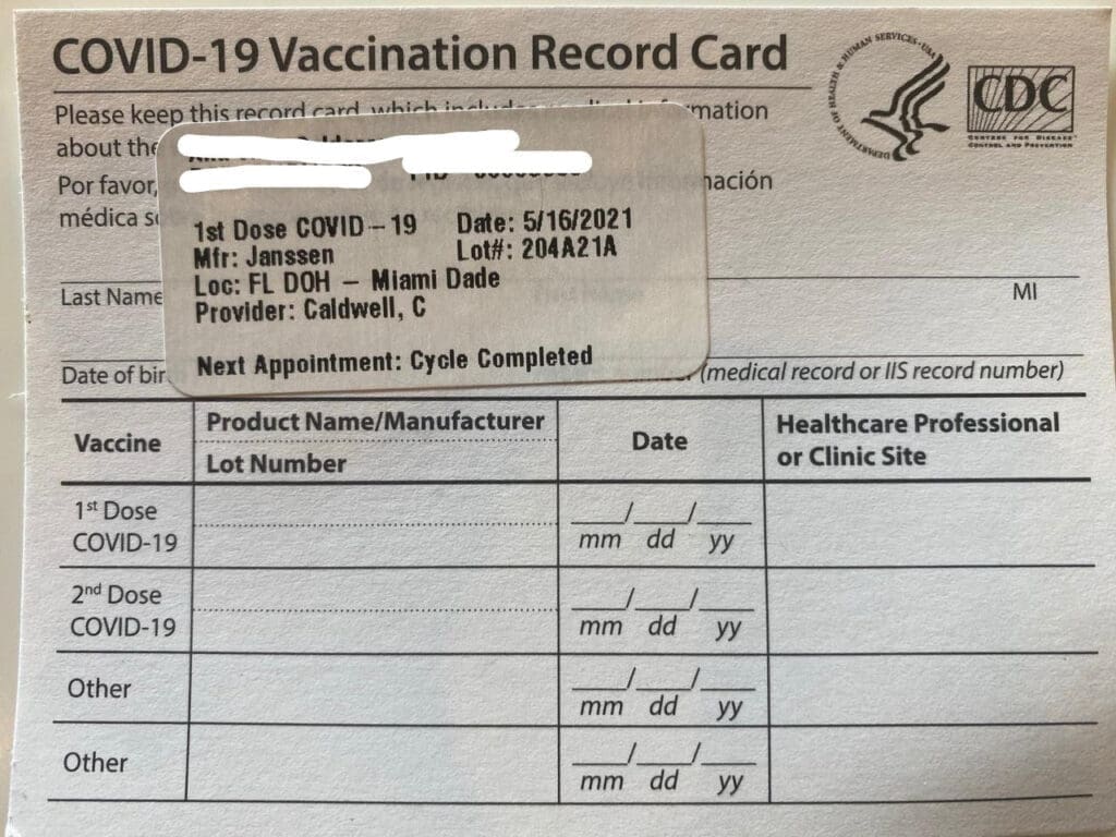 “Me tomaron la temperatura, proporcioné un documento de identificación con fotografía reciente (pasaporte), me preguntaron si le tenía miedo a las agujas, si planeaba quedar embarazada durante los próximos dos meses, me aplicaron la vacuna, esperé 15 minutos sentada en una sala apartada si manifestaba efectos secundarios y me pude ir”. Así resume su experiencia Ana Calderón, 32 años, al irse a vacunar a Miami, Florida, Estados Unidos. Le aplicaron la vacuna Johnnson & Johnnson de una sola dosis.