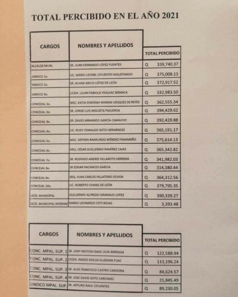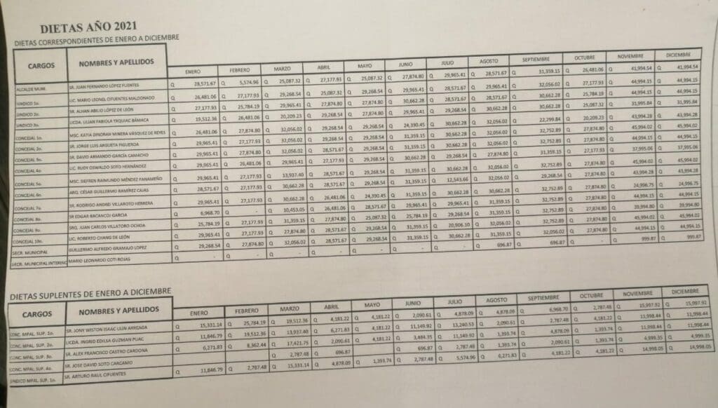 En diciembre de 2021 el jefe edil recibió Q101 mil 289.26 desglosados en: Q32 mil 294.72 de salario, Q41 mil 289.26 en dietas, Q27 mil de gastos de representación, Q9 mil por cada empresa municipal y Q9 mil más por la comuna).