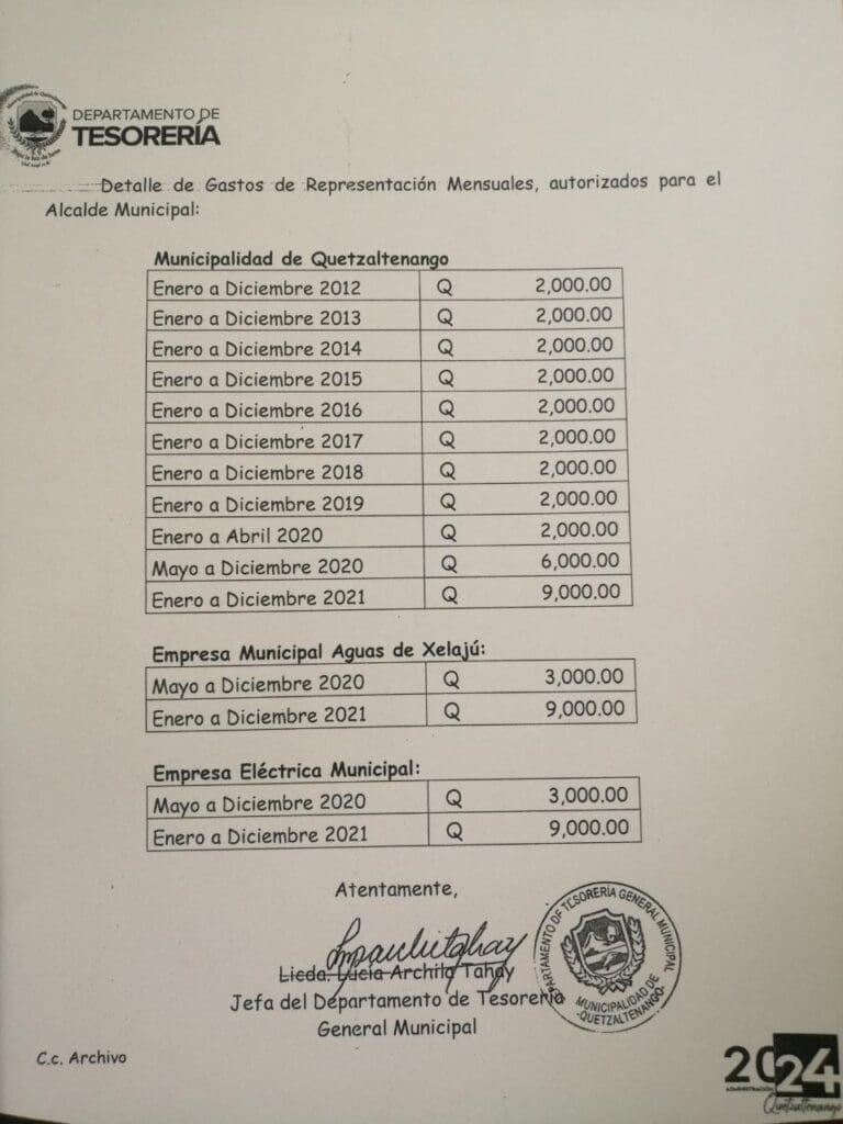 En 10 años, el salario para el alcalde de Quetzaltenango pasó de Q10 mil 266 a Q32 mil 294, además de las dietas y gastos de representación, estos últimos aumentaron de Q2 mil a Q9 mil por la municipalidad, más Q9 mil por la Empresa EléctricaMunicipal de Quetzaltenango (Emaq) y Q9 mil por la Empresa Municipal Aguas de Xelajú (EMAX).