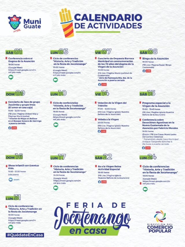 Adicional a ello, hay actividades religiosas a celebrar en línea durante agosto a través de la plataforma Zoom, Facebook Live y Google Meet, tales como programas especiales de la Virgen de la Asunción, conferencias y shows infantiles.