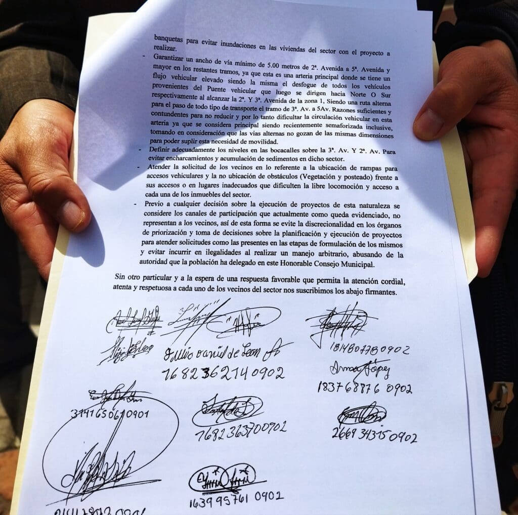Los vecinos conformaron un grupo y junto a su abogado presentaron un memorial de peticiones al Concejo de Salcajá para pedir explicaciones. De momento lograron detener los trabajos y acordaron una reunión para el lunes 16 de agosto.