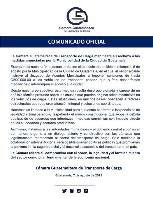 La municipalidad de Guatemala emitió un comunicado en el que anunció que el alcalde Ricardo Quiñónez instruyó al Juzgado de Asuntos Municipales para imponer multas de hasta Q500 mil a estos camiones. “Esta medida tiene como objetivo prevenir futuras interrupciones, exigir responsabilidad a los causantes y garantizar que asuman las consecuencias establecidas”, puntualizó la comuna.