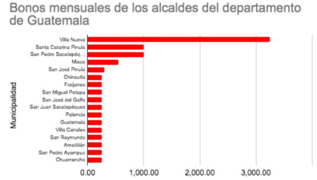 Las bonificaciones también varían: aunque la mayoría (12) goza de Q250 adicionales, en cumplimiento al Decreto 37-2001, hay 7 alcaldes que reciben más. La mayor es la de Javier Gramajo, de Villa Nueva, quien recibe dos bonos que suman Q3 mil 250.