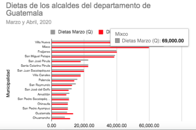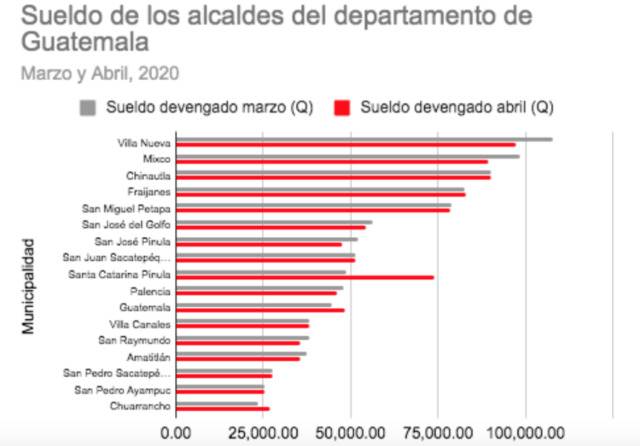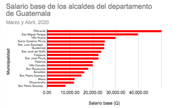En Marzo y Arbil de 2020, el salario base más alto lo tuvo Brenda Elizabeth Del Cid Medrano de Montiel de Chinautla, con Q50 mil. El más bajo, en cambio, Noel Leopoldo Boror Hernández, de San Pedro Sacatepéquez (SPS) con Q8 mil.