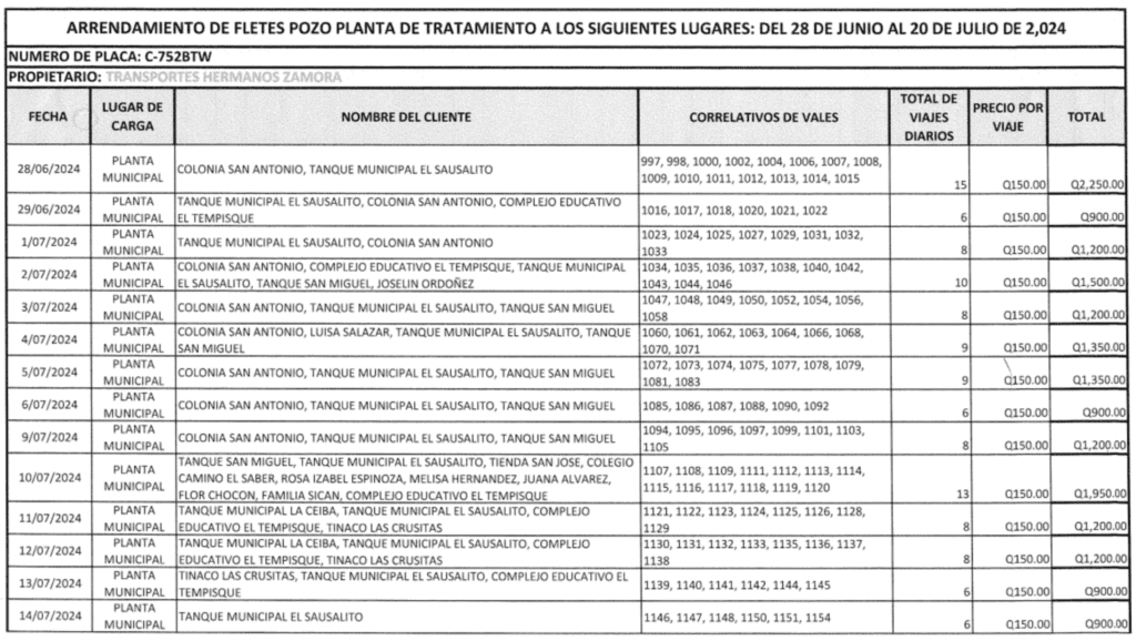En la administración anterior, de Wilton Berreondo, Fraijanes también arrendaba el servicio de pipas para transportar el agua de la planta municipal a las diversas aldeas. El último servicio que pagó la comuna en 2023 data del 27 de septiembre. Fueron 32 viajes por un costo de Q24 mil 800.