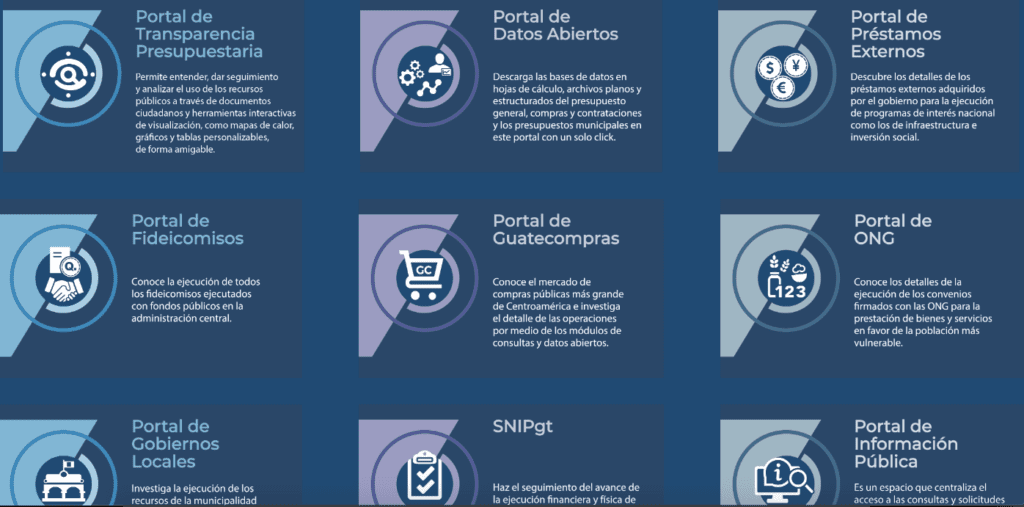 A continuación, se resumen cuáles son los portales que podrán encontrarse en transparenciagubernamental.gob.gt
