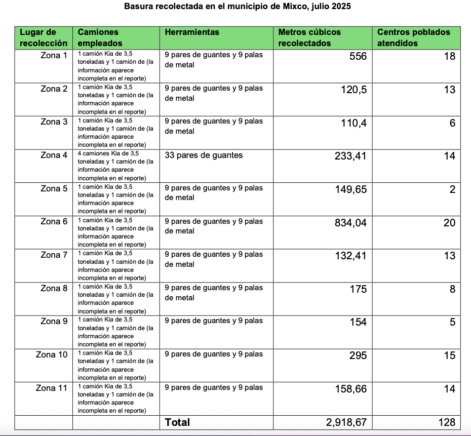 De acuerdo con el detalle, los camiones designados para el tren de aseo recorrieron 128 centros poblados (colonias de cada zona) y recolectaron 2 mil 918.97 metros cúbicos de basura.