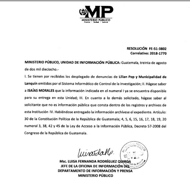 Existe otro antecedente. El 30 de agosto de 2018 este medio obtuvo del MP, con Consuelo Porras a la cabeza, el estado de las denuncias que se seguían a la alcaldesa de Lanquín, Alta Verapaz, Lilian. Pop.