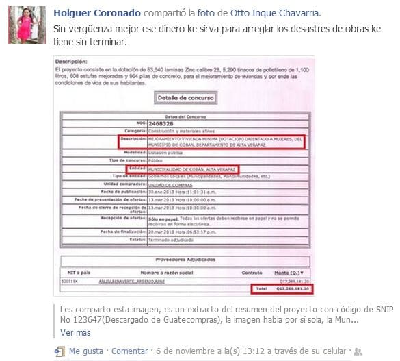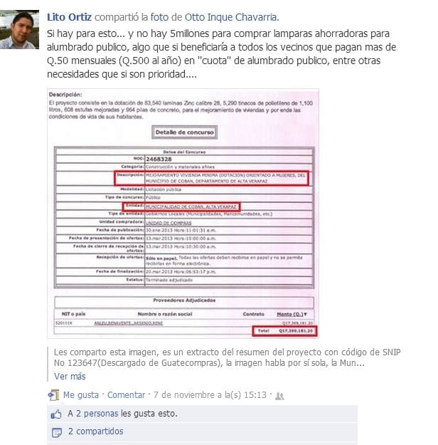 Otto Inque Chavarría, vecino de Cobán, colocó la imagen del concurso en Facebook, el pasado 6 de noviembre, la cual fue compartida en 24 ocasiones, la mayoría de casos en rechazo al monto de la inversión realizada por la comuna. Uno de los usuarios de la red social, Lito Ortiz, cuestiona las prioridades del jefe edil, Leonel Arturo Chacón Barrios. “Sí hay para esto… y no hay Q5 millones para comprar lámparas ahorradoras para alumbrado público, algo que sí beneficiaría a todos los vecinos que pagan más de Q50 mensuales en «cuota» de alumbrado público”.