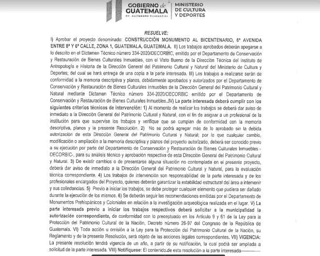 Para desarrollar el proyecto, por encontrarse en el Centro Histórico, se requería una autorización del Instituto de Antropología e Historia (Idaeh), el cual debe revisar el diseño de toda obra a realizarse en ese sector. La municipalidad envió una copia del permiso otorgado el 22 de diciembre de 2020 donde, como en todos los demás documentos, se aprueba la construcción del “monumento al bicentenario”.