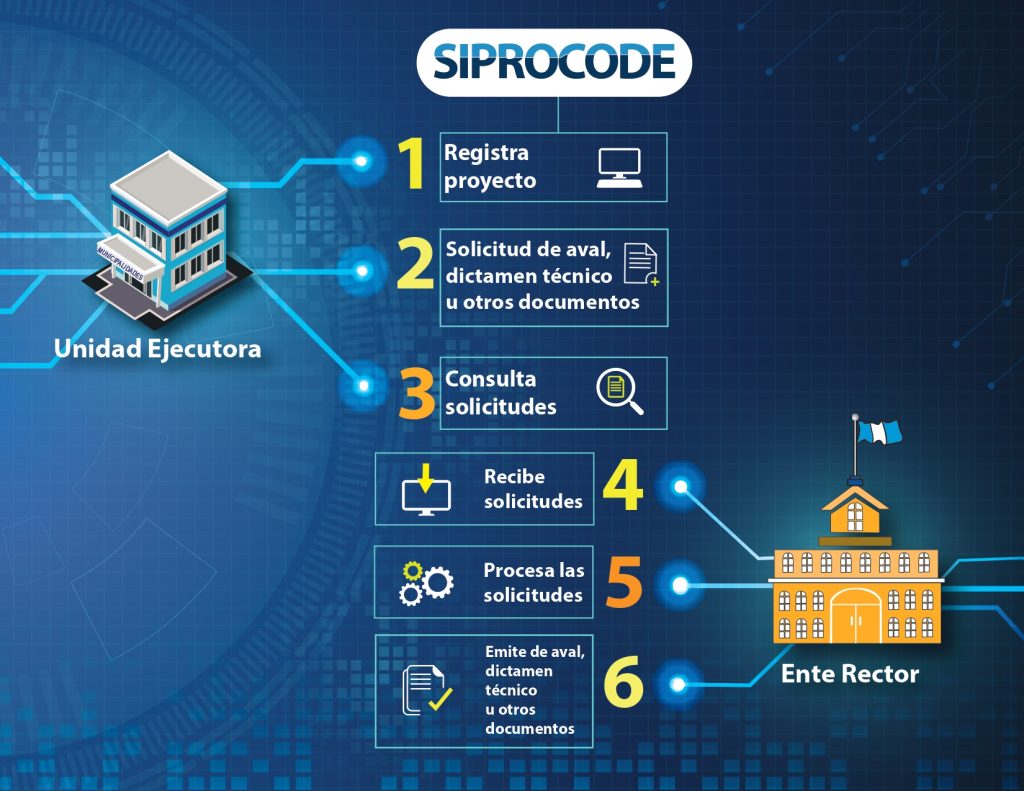 Para gestionar de forma más rápida los procesos entre instituciones, existe el Sistema Electrónico para la Administración de Proceso de Proyectos de Consejos de Desarrollo (Siprocode). Lo administra la Secretaría de Coordinación Ejecutiva de la Presidencia (SCEP).