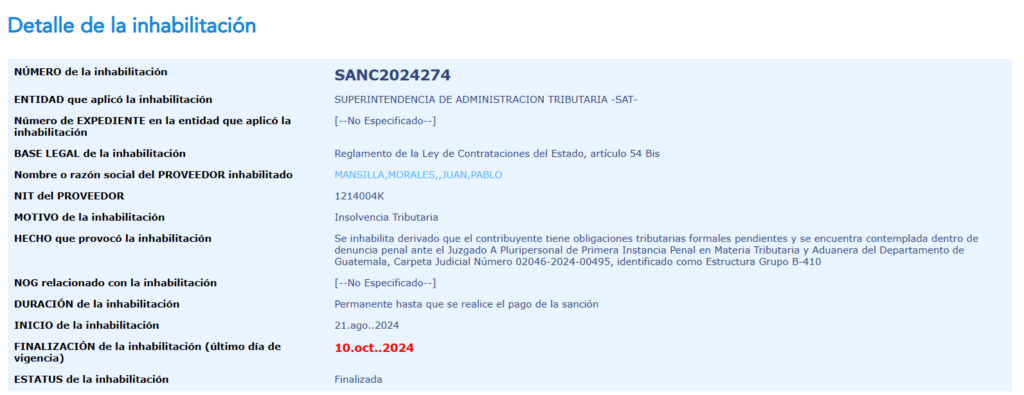 Mansilla fue inhabilitado por la Superintendencia de Administración Tributaria (SAT) el 21 de agosto de 2024 con motivo de “insolvencia tributaria”. Guatecompras detalla que el proveedor estuvo contemplado dentro de la Estructura Grupo B-410. La suspensión terminó el 10 de octubre de 2024 por haber realizado el pago de la sanción, según el portal.