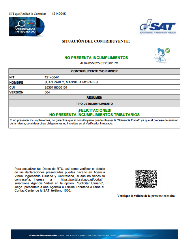 Las “felicitaciones” que mencionó Gallio fueron obtenidas a través de la herramienta Verificador Integrado. Según Fabián Galindo, comunicador de la SAT, este portal verifica los distintos tipos de incumplimientos que un contribuyente tiene ante la SAT. Identifica aquellos que pueden limitar la emisión de la Solvencia Fiscal. Comprueba omisos, hace consulta de facturas, notas de crédito, notas de débito, recibos, nota de abono y factura electrónica.