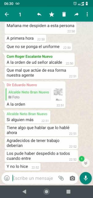 La mañana de este viernes se divulgó en redes sociales un chat grupal entre el alcalde, Neto Bran y su equipo. En este pidió al gerente e Emixtra, Roger Escalante, despedir a la trabajadora al siguiente día.