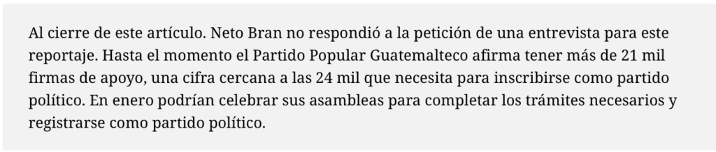 Neto Bran no está solo. Ahora es parte del Partido Popular Guatemalteco, que a pesar de su nombre, todavía no es un partido político.