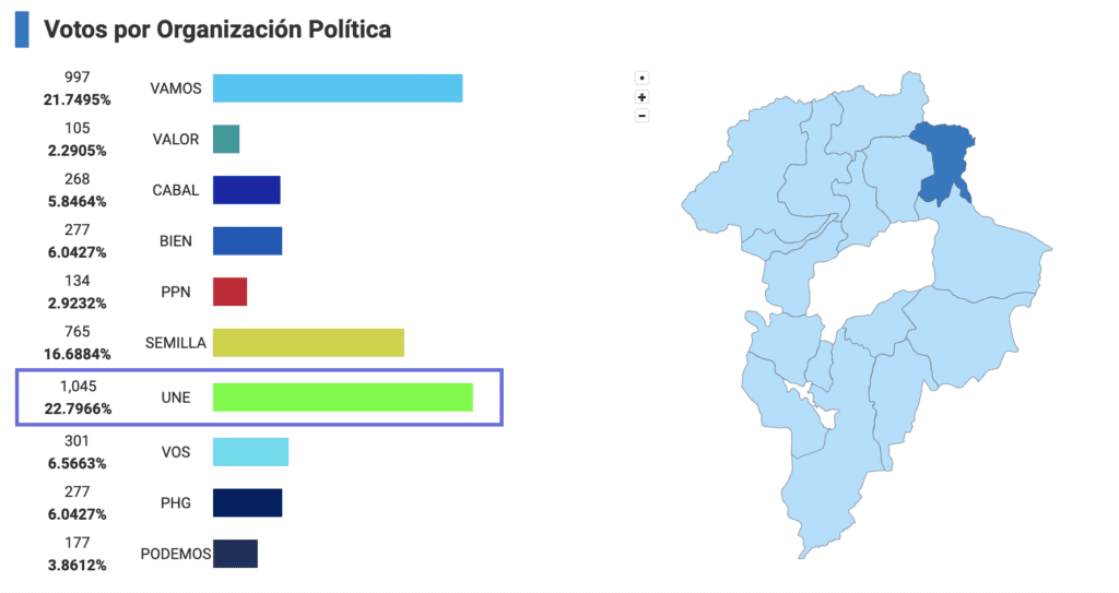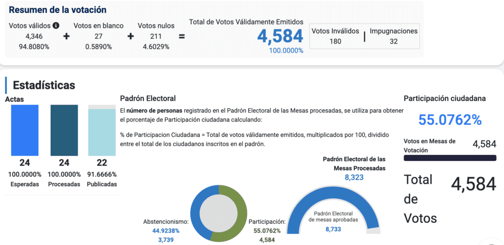 El Tribunal Supremo Electoral repitió las elecciones municipales donde ganó la candidata de la UNE. Yéssica Palencia compitió contra nueve aspirantes y obtuvo el 22.79 % de los votos.