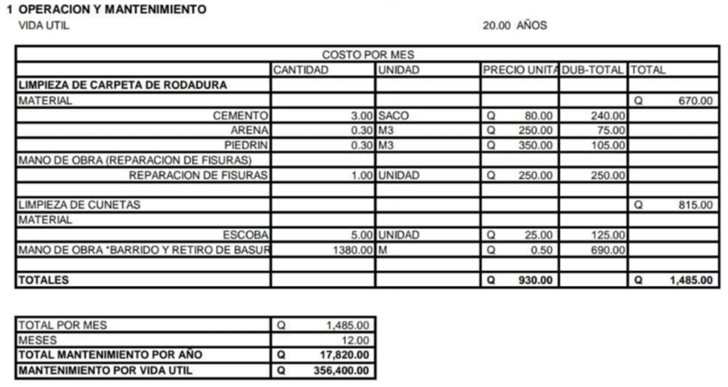 Cada año el costo estimado es de Q17 mil 820. En dos décadas, la inversión deberá sumar Q356 mil 400 para conservar la obra en condiciones adecuadas.