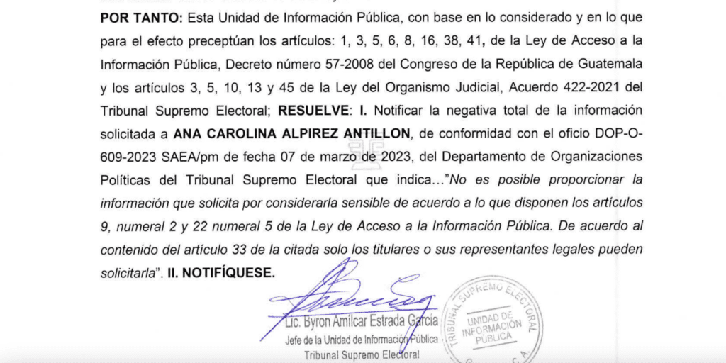 Ana Carolina Alpírez, directora de Ojoconmipisto, no pidió información sensible ni confidencial. Es más, ni el Tribunal Supremo Electoral requiere esa información a los candidatos. Solicitó la información pública de una actividad pública, de personas que aspiran a un cargo público.