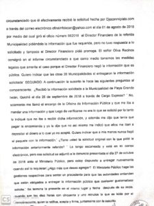 La municipalidad dijo al Ministerio Público que el 26 de septiembre de 2018 había entregado una encomienda con la información al corresponsal de Ojoconmipisto. Sin embargo, esto no fue así. El encargado de la Unidad de Información Pública (UDI) llamó al reportero para avisarle, pero no era la información solicitada. Esto se expuso al momento de ratificar la denuncia.
