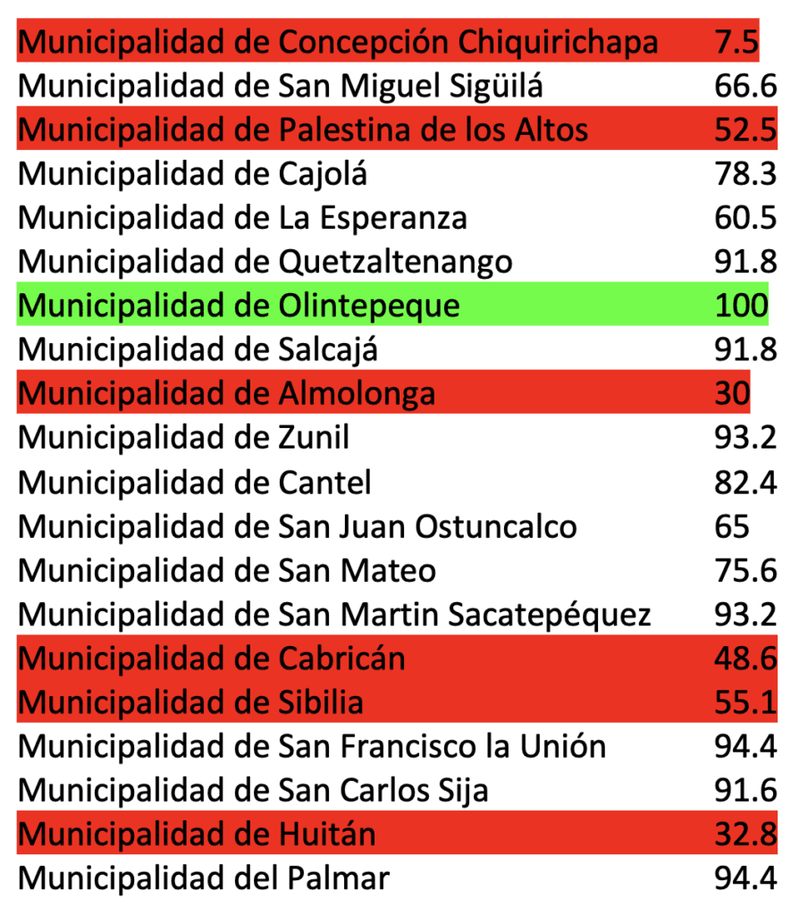 El informe incluye a 20 de los 24 municipios de Quetzaltenango, de estos, seis alcanzaron baja calificación (debajo de 60) en el cumplimiento de la Ley de Acceso a la Información Pública (LAIP).