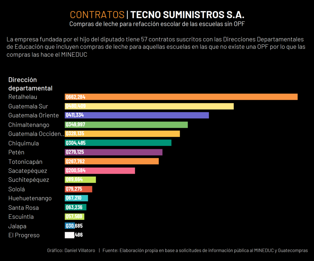 En total, las 16 direcciones departamentales han comprado Q6 millones en concursos que incluyen leche en polvo. De estos, Q3.7 millones han ido a la distribuidora de Gold Star. El proveedor que queda en segundo lugar ha tenido solo nueve contratos en comparación con los 57 de Tecno Suministros.