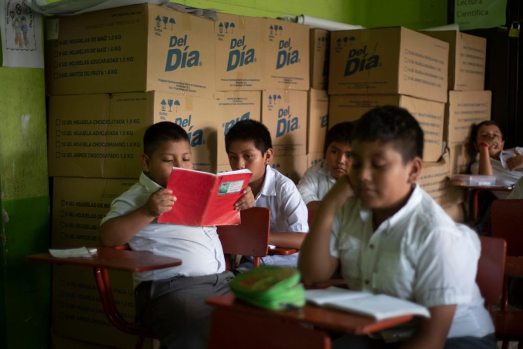 Las paredes verdes de esta escuela casi no se ven. Filas de cuatro cajas de alimentos, una sobre otra, cubren la superficie y hasta arriba se aprecia que funcionan como un mueble improvisado para carteles y otros materiales didácticos. Un niño, un poco cansado, se apoya sobre las cajas–paredes en la Escuela José Venancio López, en la zona 1 de la Ciudad de Guatemala, a inmediaciones de un mercado cantonal. Así como esta, existen establecimientos que carecen de una cocina para preparar comida, de padres y madres que se organicen y trabajen de forma voluntaria, y de una bodega para guardar las cajas.
