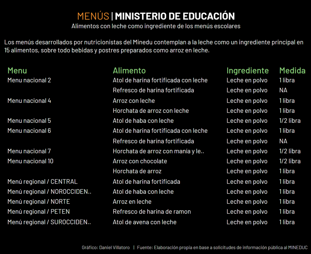 Cuando la Ley de Alimentación Escolar se aprobó en el Congreso, esta llegó impulsada por figuras como Carlos Rafael Fión Morales, legislador y empresario distribuidor de leche. La norma incrementó el monto destinado para la compra de alimentos para las escuelas públicas, de Q1.11 aumentó a Q4 por alumno. Entre estos productos, está la leche.
