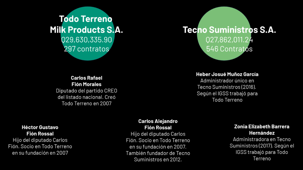 Tecno Suministros, S.A. es el proveedor predilecto de leche en polvo para brindar comida en las escuelas. Se trata de una compañía fundada por Carlos Alejandro Fión Rossal, hijo del diputado que impulsó la Ley de Alimentación Escolar. La normativa aumentó la inversión de Q1.11 a Q4 por estudiante, esto favoreció no solo a los niños que asisten a escuelas públicas sino también a las empresas que han estado relacionadas con la familia Fión. Con 59 contratos que suman más de Q3.7 millones, Tecno Suministros es la favorita para dar leche en las aulas.