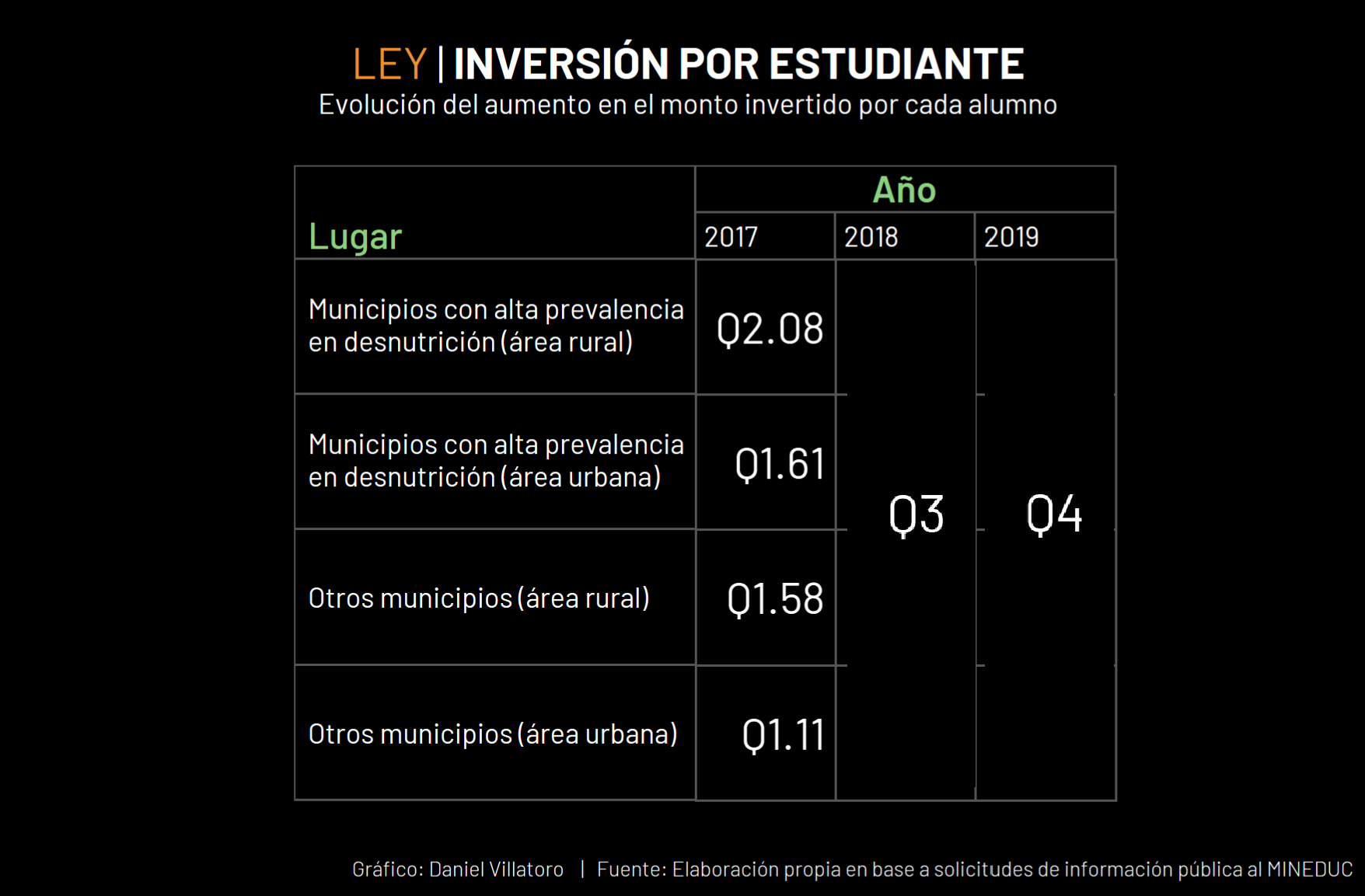 En un país en el que el 16 por ciento de la población (2.7 millones) tiene un nivel de Inseguridad Alimentaria severo, un 22 por ciento (3.8 millones) moderado y 38 por ciento (6.6 millones) leve, esta ley se vio favorable. Para que el cambio no fuera tan drástico y en consideración con los procesos de presupuesto anual del Estado, se contempló un aumento gradual para la inversión por escolar: Q3 diarios en 2018 y a partir del 2019, Q4 por estudiante.