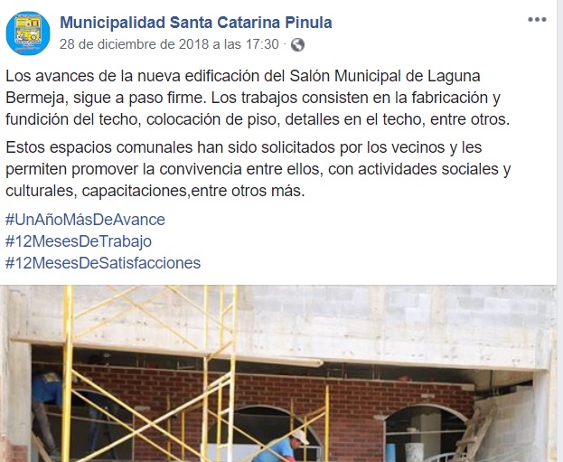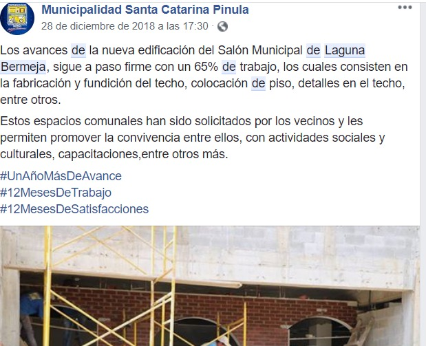 A partir de febrero de 2019, al menos 2,360 pobladores en la aldea Laguna Bermeja, Santa Catarina Pinula, contarán con un salón de usos múltiples por el que la municipalidad cancelará Q2.4 millones.