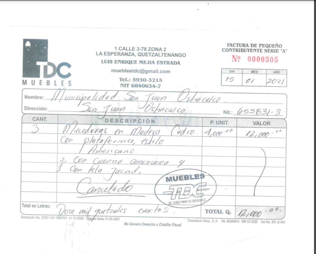 Cada silla a un precio de Q4 mil. A decir del alcalde el costo no es excesivo a pesar de la calidad del material. Los vecinos opinan lo contrario. “Hay pobreza en San Juan Ostuncalco, hay muchas necesidades en todas las comunidades y el alcalde regalando muebles a un presidente que gana más de Q125 mil al mes, eso es no tener cabeza para pensar”, reclamó Jaime Gómez, vecino y líder comunitario del municipio. Exigió a la Contraloría General de Cuentas realizar una auditoría en la municipalidad.