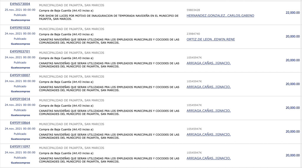 En Pajapita, San Marcos, la municipalidad compró canastas navideñas para sus empleados y para los miembros de sus Consejos Comunitarios de Desarrollo (cocode). Gastó Q120 mil y por el monto debió realizar un proceso de cotización sin embargo lo fraccionó en cinco compras de Q20 mil cada una el pasado 24 de noviembre en la modalidad de baja cuantía.