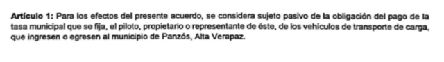 La municipalidad de Panzós, Alta Verapaz, inició el cobro de una tasa municipal para el ingreso de vehículos. El consejo municipal lo autorizó (Acta 25-2020) y publicó el 9 de julio en el Diario Oficial.